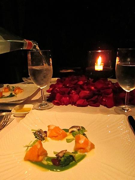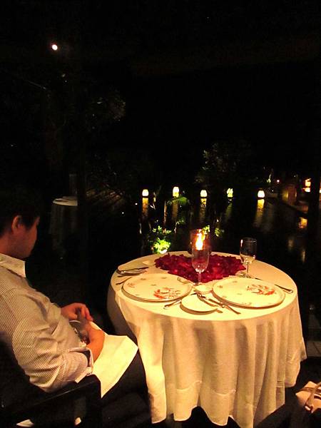 二周年,所以飯店一如預期地為我們在餐桌上預備了玫瑰花瓣。餐桌正對著餐廳外的水塘,燈光、植栽,清雅的造景,可惜