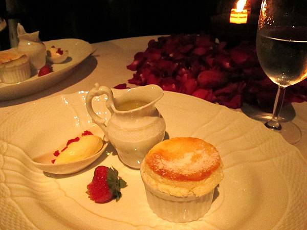 而草莓舒芙蕾則剛剛出爐,我們用湯匙把隆起的舒芙蕾弄破,把溫熱的奶汁倒入再蘸著草莓和冰淇淋吃。最完美的Ending也不過如此。